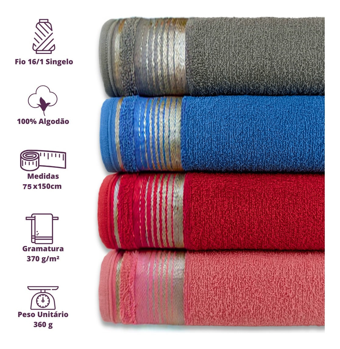 - Confeccionadas em 100% algodão e com gramatura de 370 g/m², essas toalhas oferecem alto poder de absorção, toque suave e resistência ao uso contínuo. A medida generosa de 80x150cm garante total cobertura e conforto, além de um visual luxuoso no banheiro. São perfeitas tanto para o uso doméstico quanto para hotéis, pousadas e enxovais.